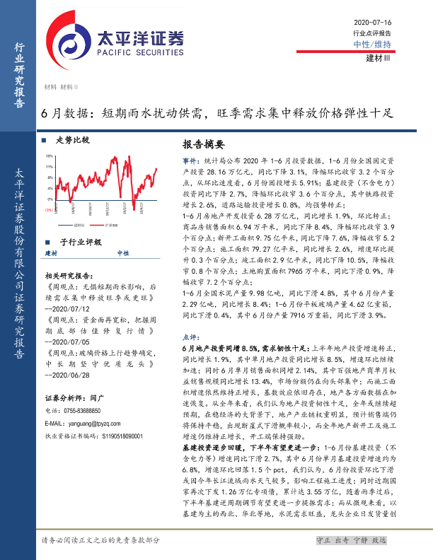 【太平洋证券】【20200716】建材Ⅲ6月数据:短期雨水扰动供需,旺季需求集中释放价格弹性十足-7页