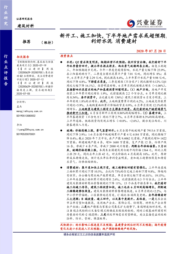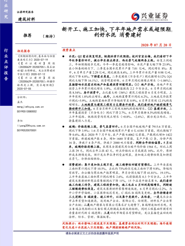 【兴业证券】【20200720】新开工、施工加快,下半年地产需求或超预期,利好水泥+消费建材-7页