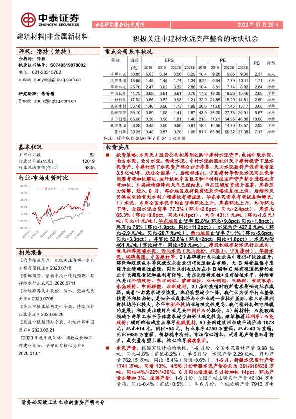 【中泰证券】【20200725】非金属新材料行业周报:积极关注中建材水泥资产整合的板块机会-23页