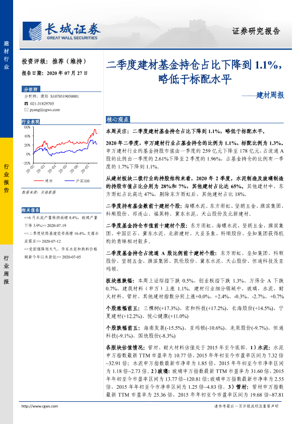 【长城证券】【20200727】二季度建材基金持仓占比下降到1.1%,略低于标配水平-20页
