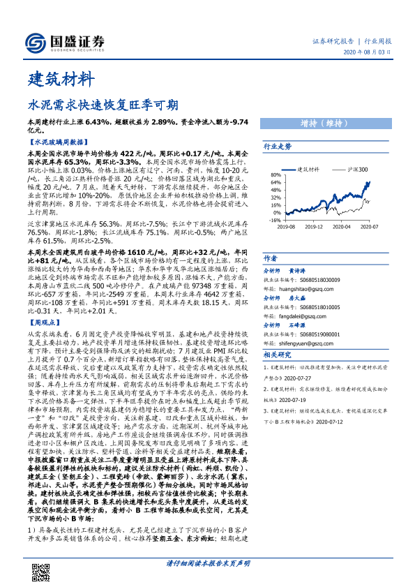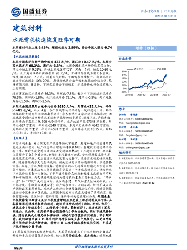 【国盛证券】【20200803】建筑材料行业周报:水泥需求快速恢复旺季可期-24页