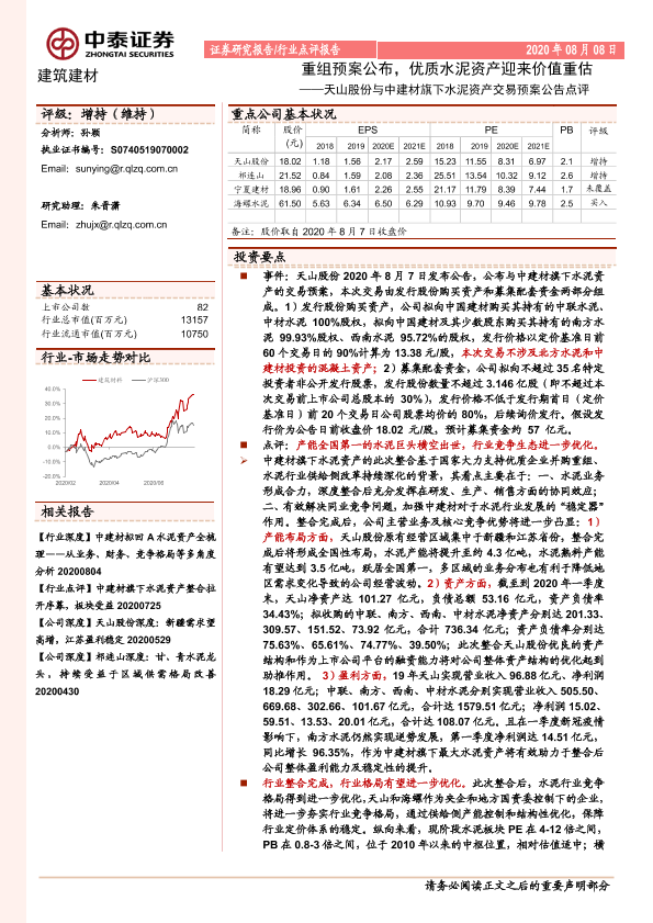 【中泰证券】【20200808】天山股份与中建材旗下水泥资产交易预案公告点评:重组预案公布,优质水泥资产迎来价值重估-5页