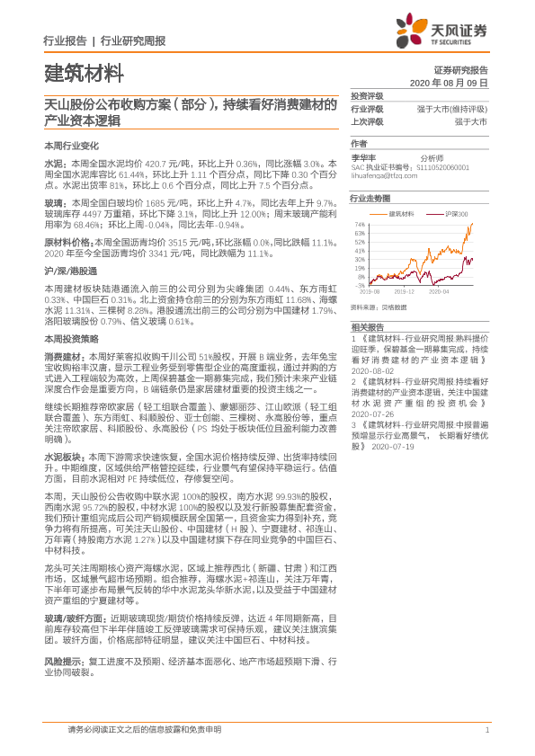 【天风证券】【20200809】建筑材料行业研究周报:天山股份公布收购方案(部分),持续看好消费建材的产业资本逻辑-15页