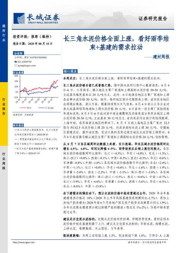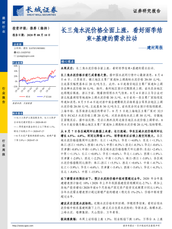 【长城证券】【20200810】建材周报:长三角水泥价格全面上涨,看好雨季结束+基建的需求拉动-19页