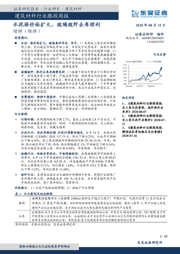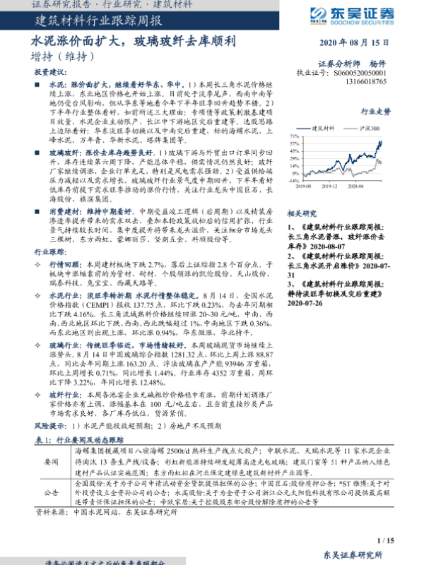 【东吴证券】【20200815】建筑材料行业跟踪周报:水泥涨价面扩大,玻璃玻纤去库顺利-15页