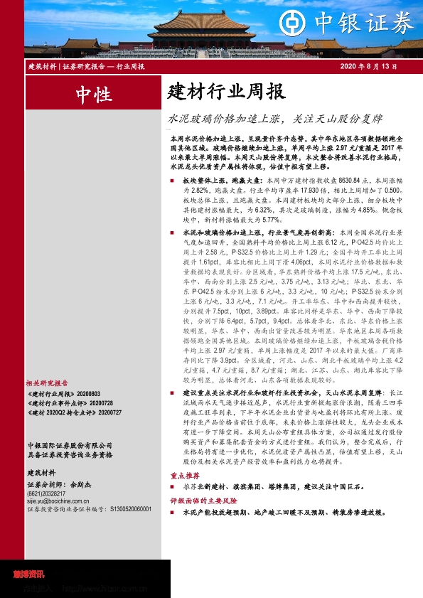 【中银证券】【20200813】建材行业周报:水泥玻璃价格加速上涨,关注天山股份复牌-15页