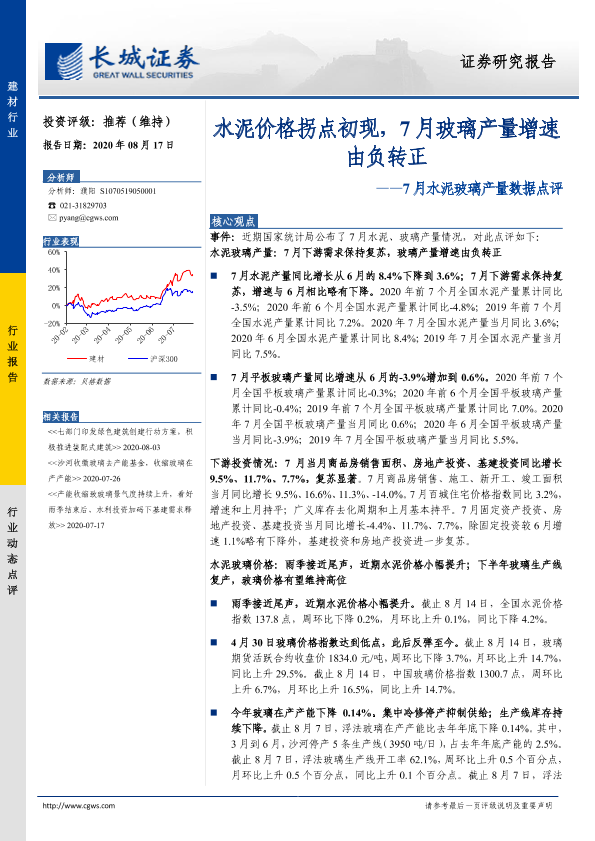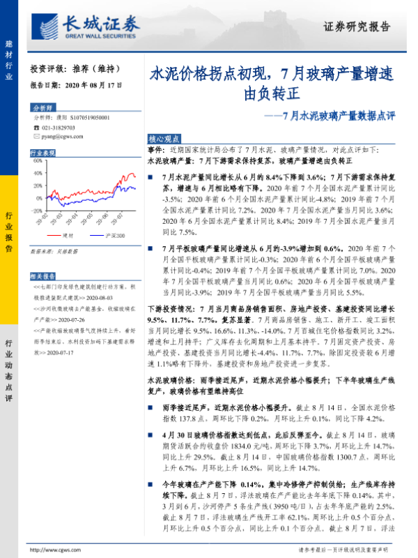 【长城证券】【20200817】7月水泥玻璃产量数据点评:水泥价格拐点初现,7月玻璃产量增速由负转正-11页
