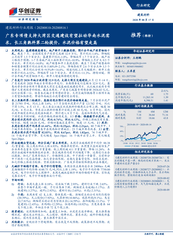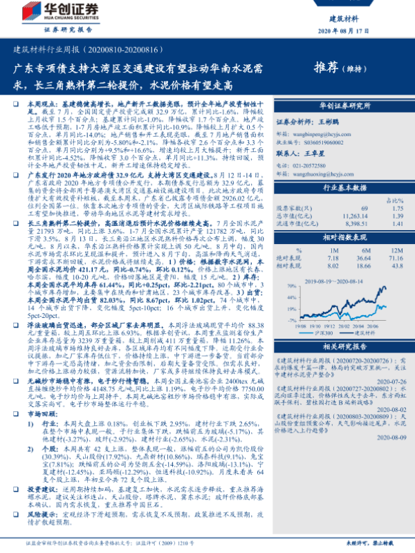 【华创证券】【20200817】建筑材料行业周报:广东专项债支持大湾区交通建设有望拉动华南水泥需求,长三角熟料第二轮提价,水泥价格有望走高-16页