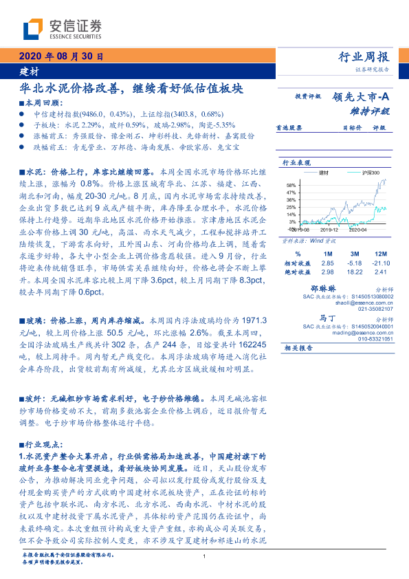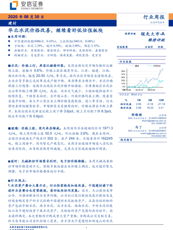 【安信证券】【20200830】建材行业周报:华北水泥价格改善,继续看好低估值板块-21页