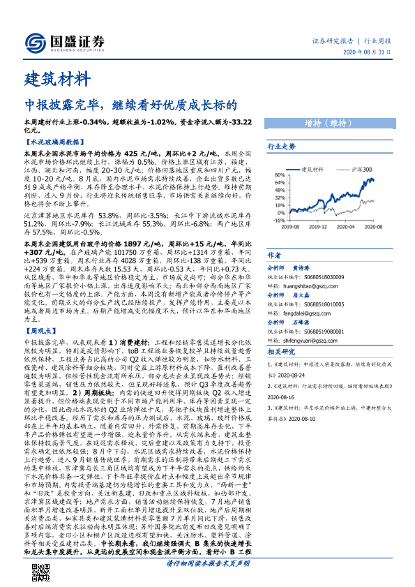 【国盛证券】【20200831】建筑材料行业周报:中报披露完毕,继续看好优质成长标的-27页