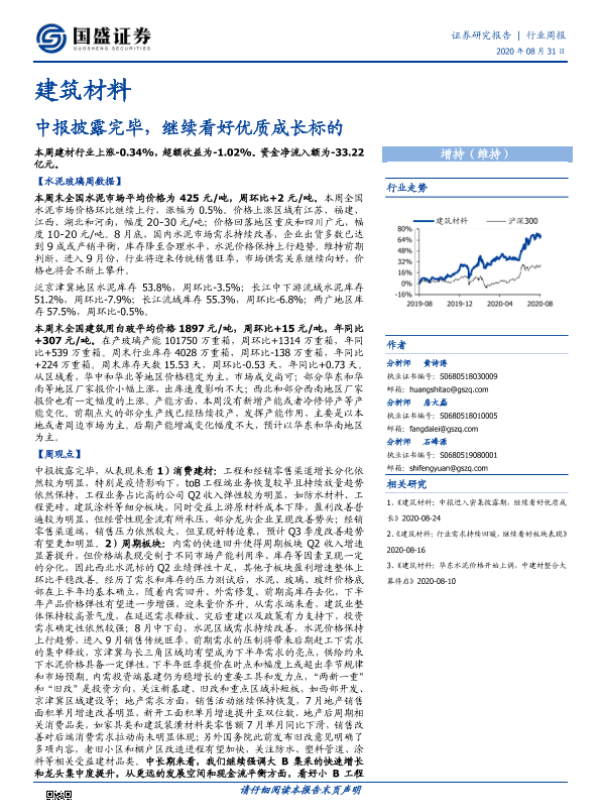 中报披露 优质成长 建筑材料 水泥玻璃 行业周报