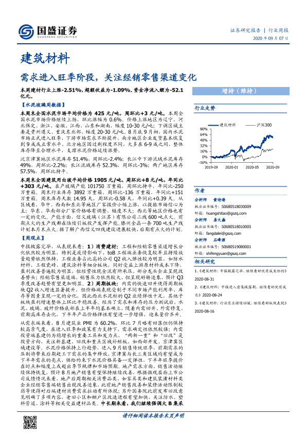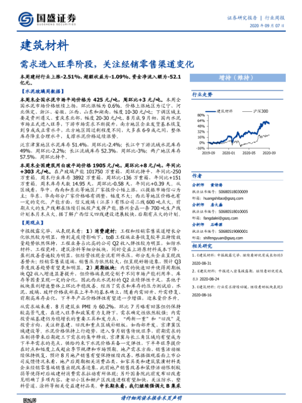 【国盛证券】【20200907】建筑材料行业周报:需求进入旺季阶段,关注经销零售渠道变化-26页