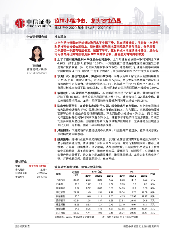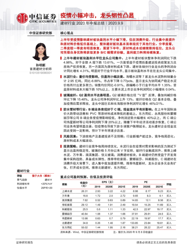 中报总结 建材行业 疫情冲击 盈利能力 龙头公司
