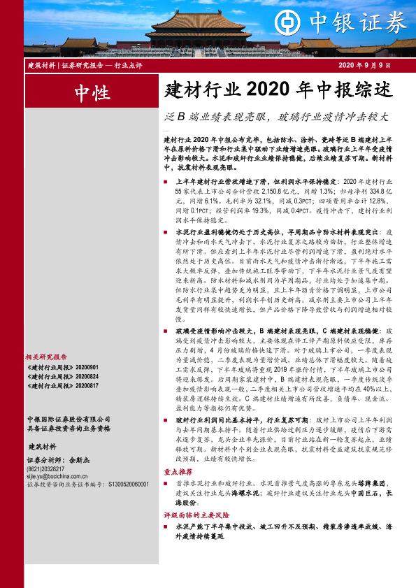 【中银证券】【20200909】建材行业2020年中报综述:泛B端业绩表现亮眼,玻璃行业疫情冲击较大-23页