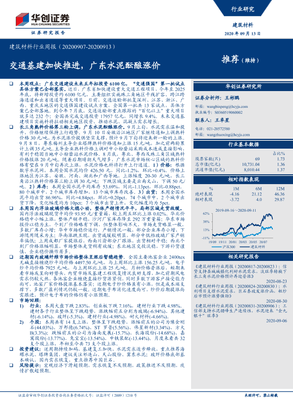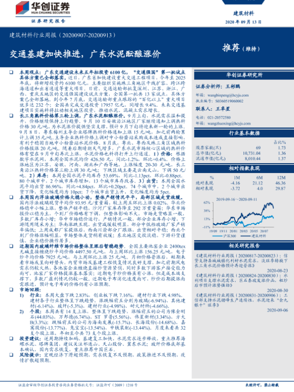 【华创证券】【20200913】建筑材料行业周报:交通基建加快推进,广东水泥酝酿涨价-15页