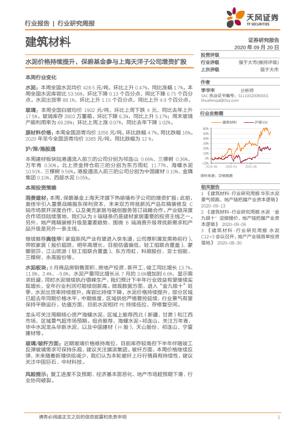 【天风证券】【20200920】建筑材料行业研究周报:水泥价格持续提升,保碧基金参与上海天洋子公司增资扩股-15页