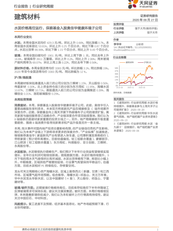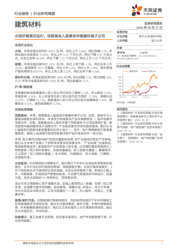 【天风证券】【20200927】建筑材料行业研究周报:水泥价格高位运行,保碧基金入股奥佳华健康环境子公司-15页