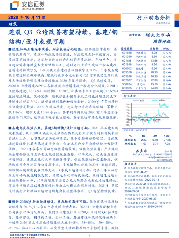 【安信证券】【20201011】建筑行业动态分析:建筑Q3业绩改善有望持续,基建、钢结构、设计表现可期-18页