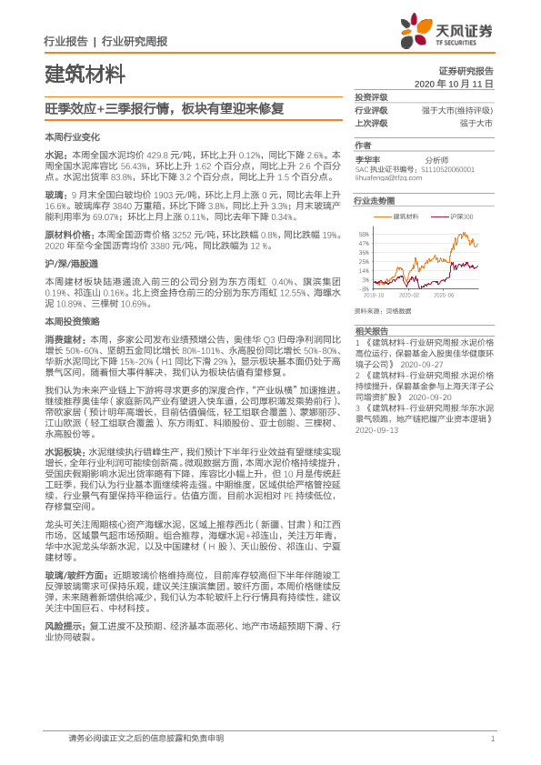 【天风证券】【20201011】建筑材料行业研究周报:旺季效应+三季报行情,板块有望迎来修复-15页