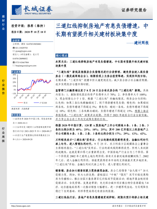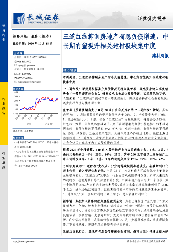 【长城证券】【20201018】三道红线抑制房地产有息负债增速,中长期有望提升相关建材板块集中度-21页