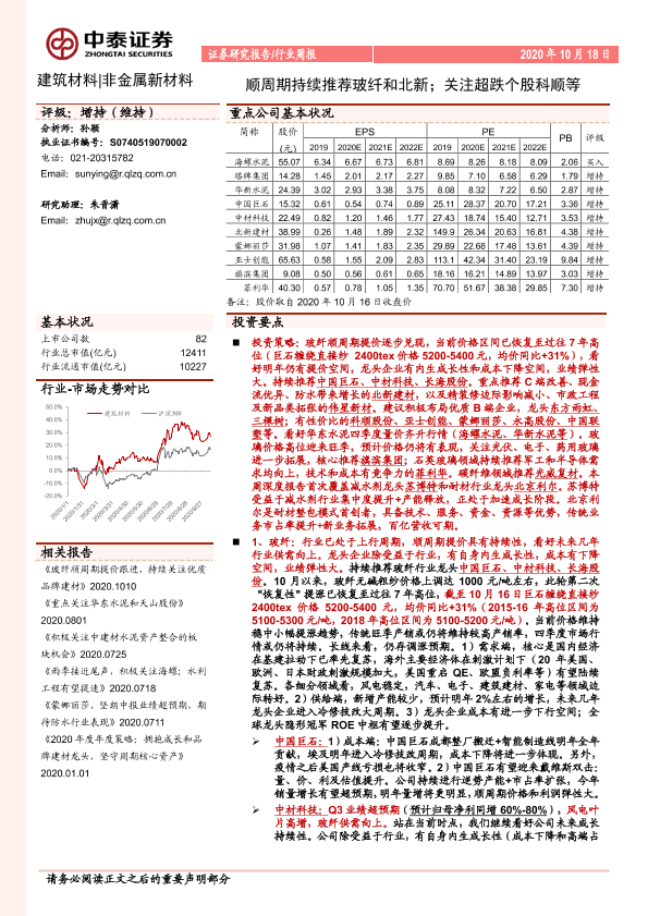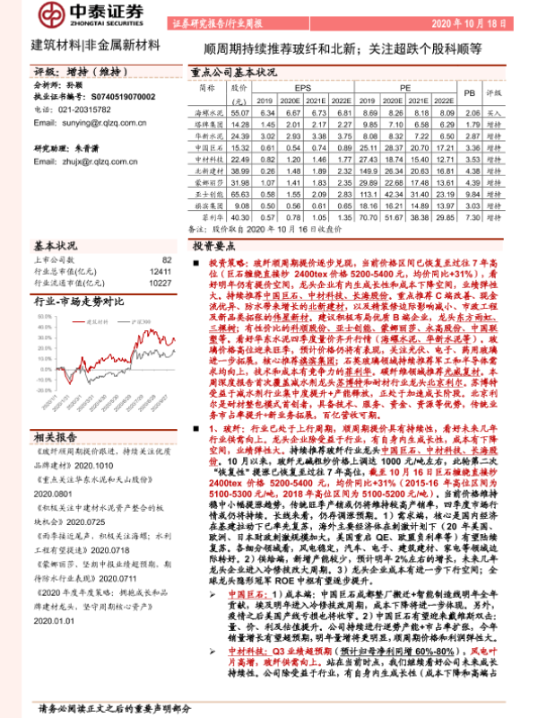 【中泰证券】【20201018】建筑材料行业周报:顺周期持续推荐玻纤和北新;关注超跌个股科顺等-25页