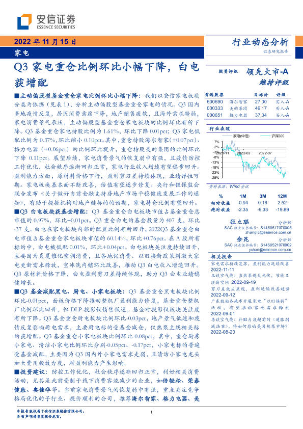 【安信证券】【20221115】Q3家电重仓比例环比小幅下降_白电获增配-12页