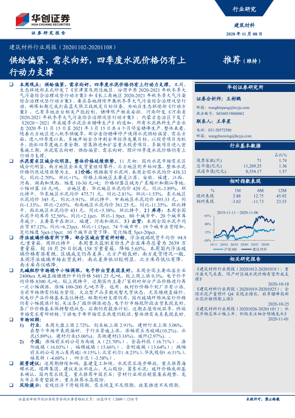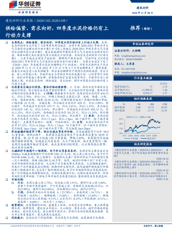 【华创证券】【20201108】建筑材料行业周报:供给偏紧,需求向好,四季度水泥价格仍有上行动力支撑-16页