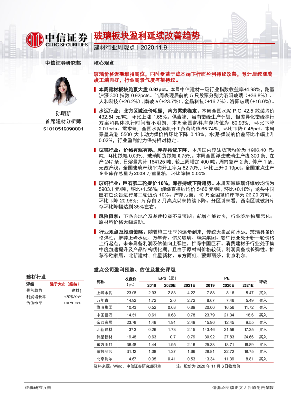 【中信证券】【20201109】建材行业周观点:玻璃板块盈利延续改善趋势-16页