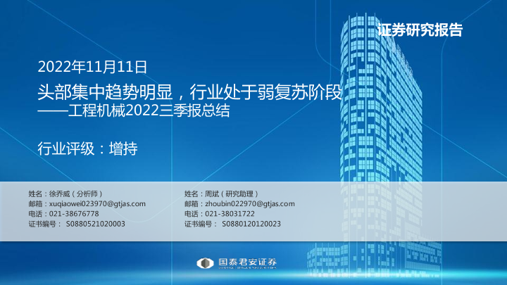 【国泰君安证券】【20221111】工程机械行业2022三季报总结:头部集中趋势明显,行业处于弱复苏阶段-23页