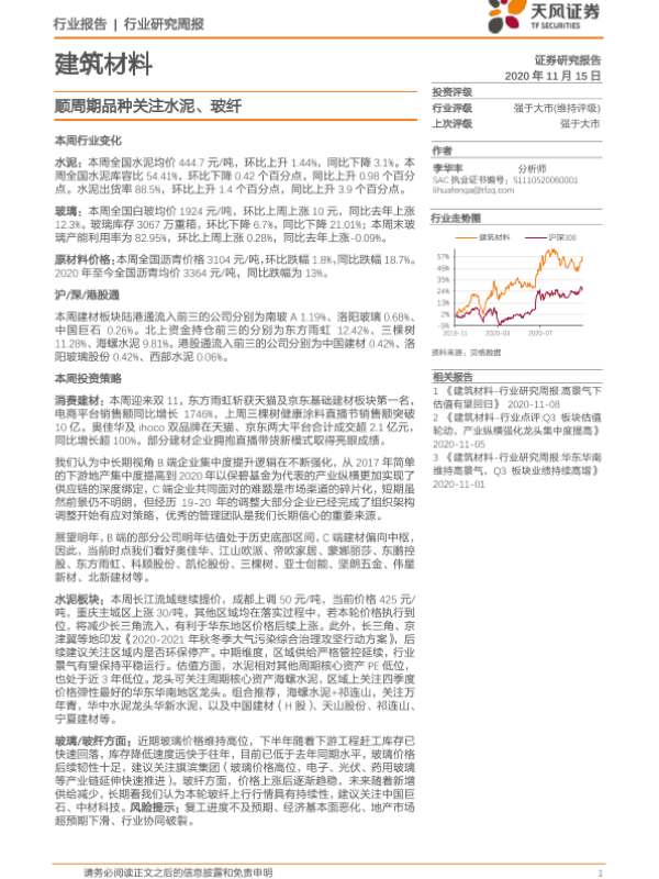 【天风证券】【20201115】建筑材料行业研究周报:顺周期品种关注水泥、玻纤-15页