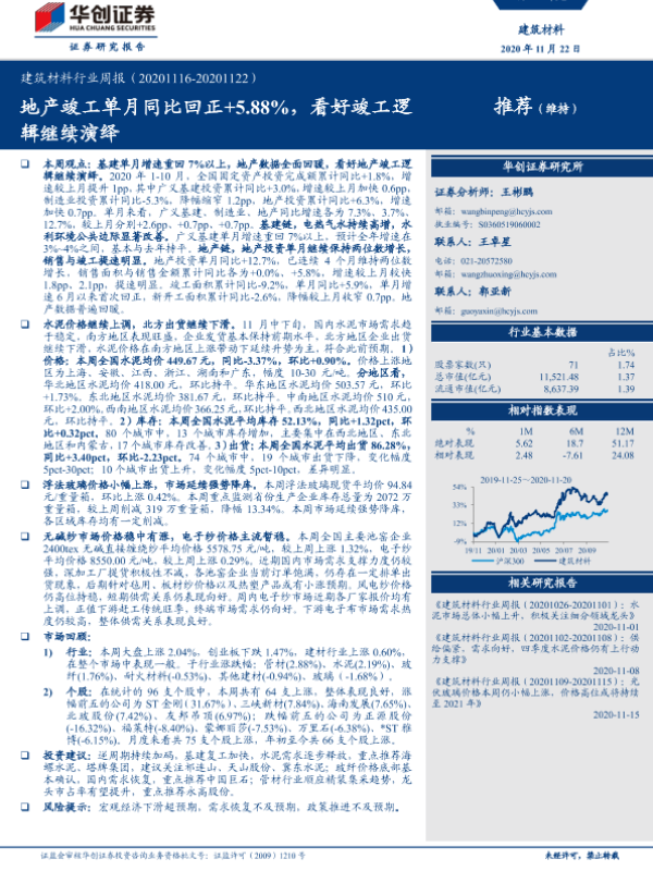 【华创证券】【20201122】建筑材料行业周报:地产竣工单月同比回正+5.88%,看好竣工逻辑继续演绎-17页