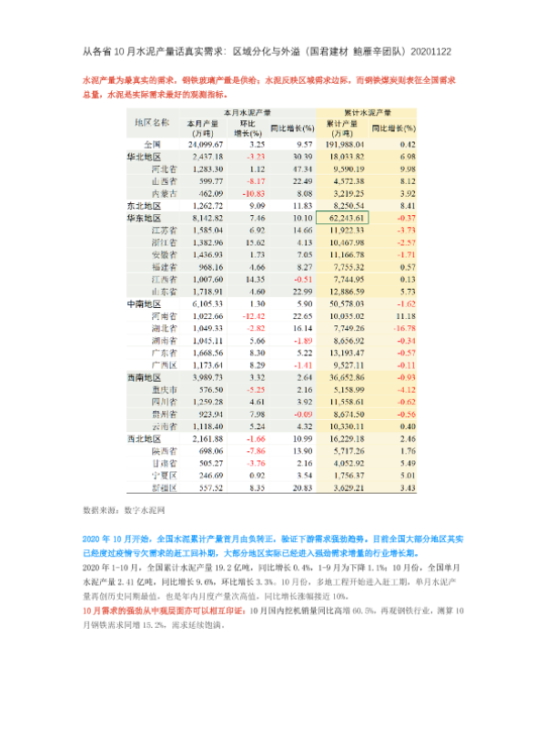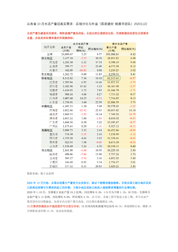 【国泰君安证券】【20201122】从各省10月水泥产量话真实需求:区域分化与外溢-4页