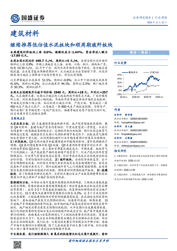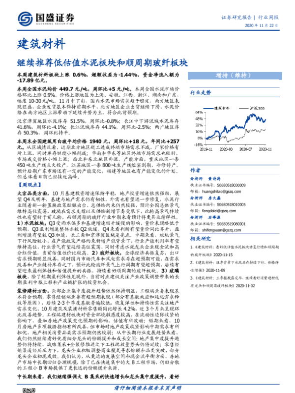 【国盛证券】【20201122】建筑材料行业周报:继续推荐低估值水泥板块和顺周期玻纤板块-24页