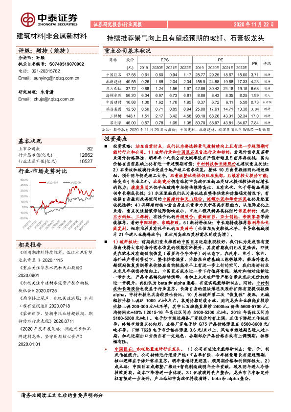 【中泰证券】【20201122】建筑材料 非金属新材料行业周报:持续推荐景气向上且有望超预期的玻纤、石膏板龙头-24页