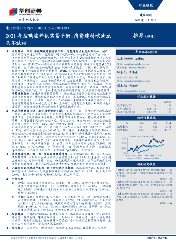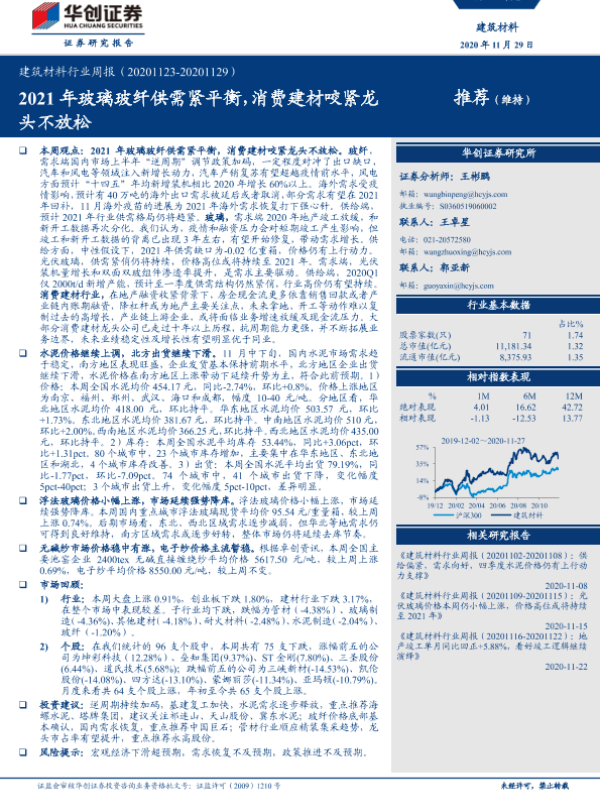 【华创证券】【20201129】建筑材料行业周报:2021年玻璃玻纤供需紧平衡,消费建材咬紧龙头不放松-17页