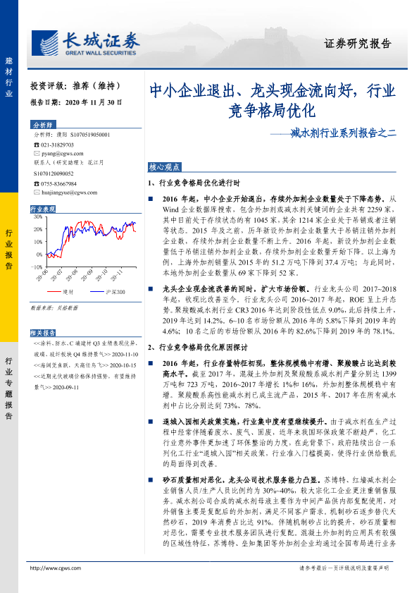【长城证券】【20201130】减水剂行业系列报告之二:中小企业退出、龙头现金流向好,行业竞争格局优化-15页