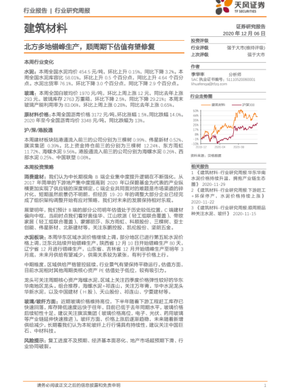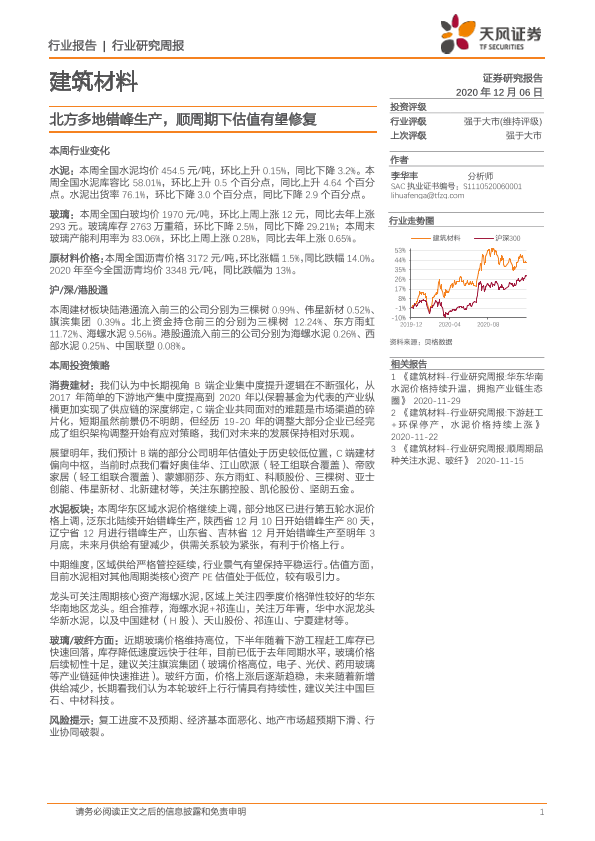【天风证券】【20201206】建筑材料行业研究周报:北方多地错峰生产,顺周期下估值有望修复-16页