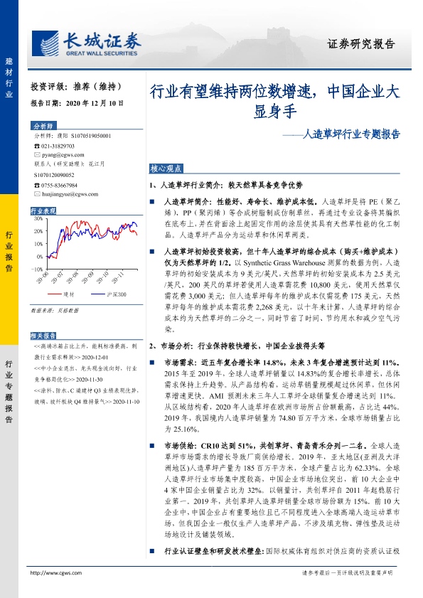 【长城证券】【20201210】人造草坪行业专题报告:行业有望维持两位数增速,中国企业大显身手-15页