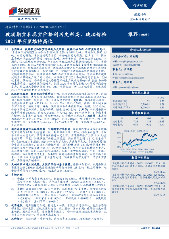 【华创证券】【20201213】建筑材料行业周报:玻璃期货和现货价格创历史新高,玻璃价格2021年有望维持高位-17页