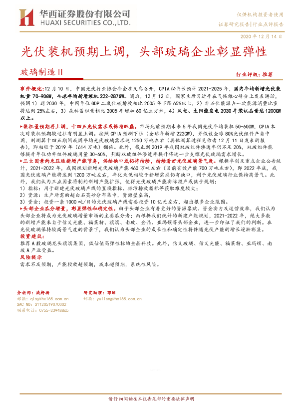 【华西证券】【20201214】光伏装机预期上调,头部玻璃企业彰显弹性-3页