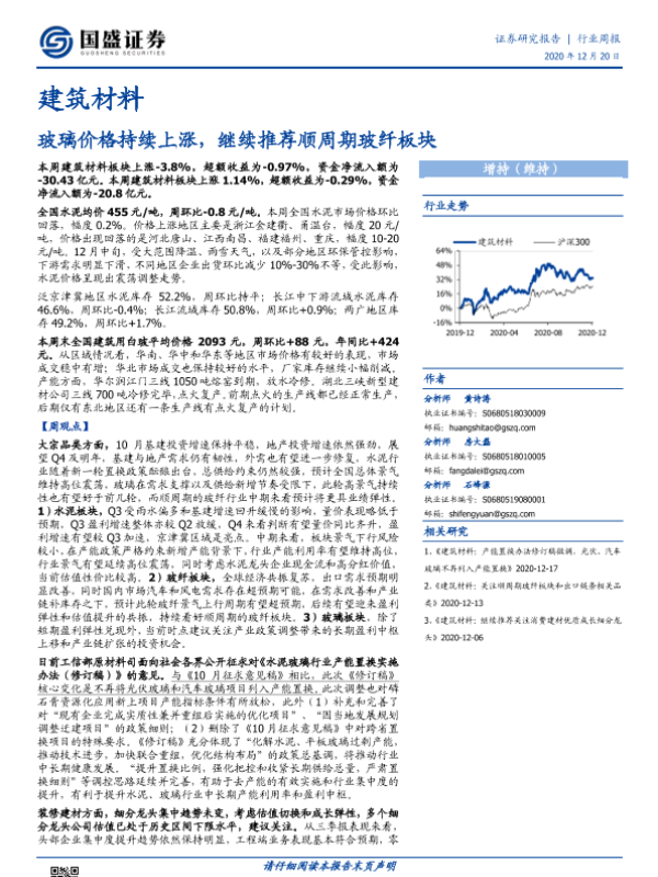 【国盛证券】【20201220】建筑材料行业周报:玻璃价格持续上涨,继续推荐顺周期玻纤板块-26页