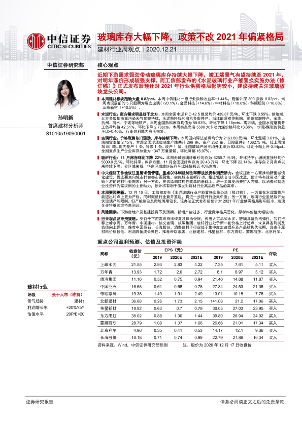 【中信证券】【20201221】建材行业周观点:玻璃库存大幅下降,政策不改2021年偏紧格局-17页