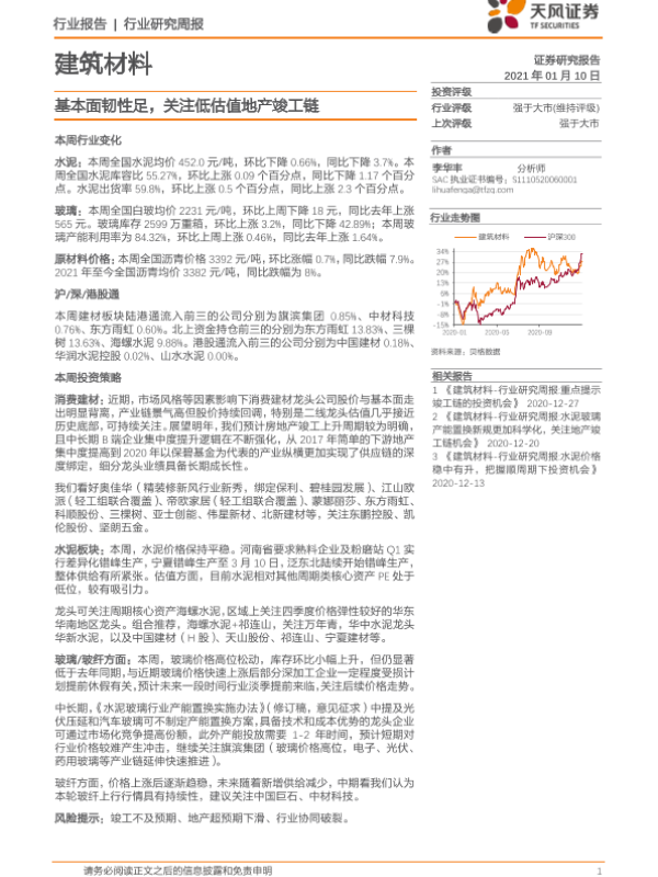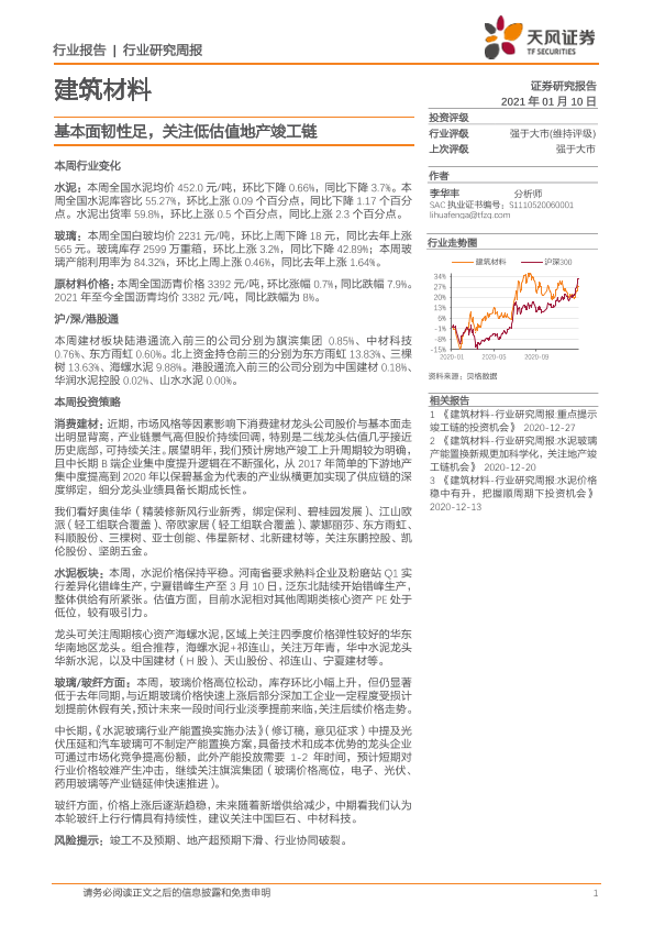 【天风证券】【20210110】建筑材料行业研究周报:基本面韧性足,关注低估值地产竣工链-16页
