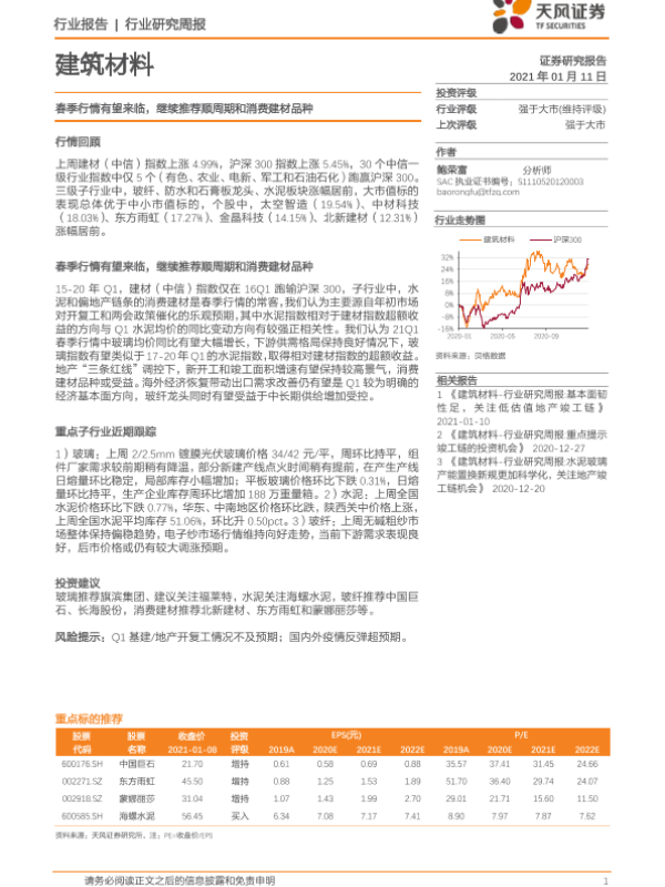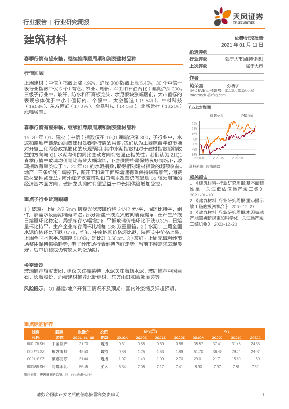 【天风证券】【20210111】建筑材料行业研究周报:春季行情有望来临,继续推荐顺周期和消费建材品种-9页