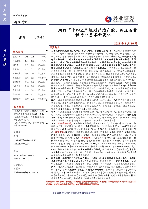 【兴业证券】【20210110】玻纤“十四五”规划严控产能,关注石膏板行业基本面变化-19页