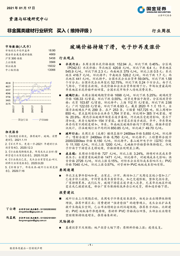 【国金证券】【20210117】非金属类建材行业研究:玻璃价格持续下滑,电子纱再度涨价-7页