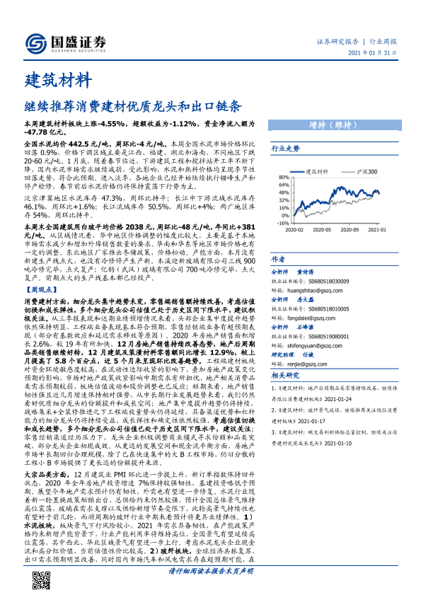 【国盛证券】【20210131】建筑材料行业周报:继续推荐消费建材优质龙头和出口链条-26页