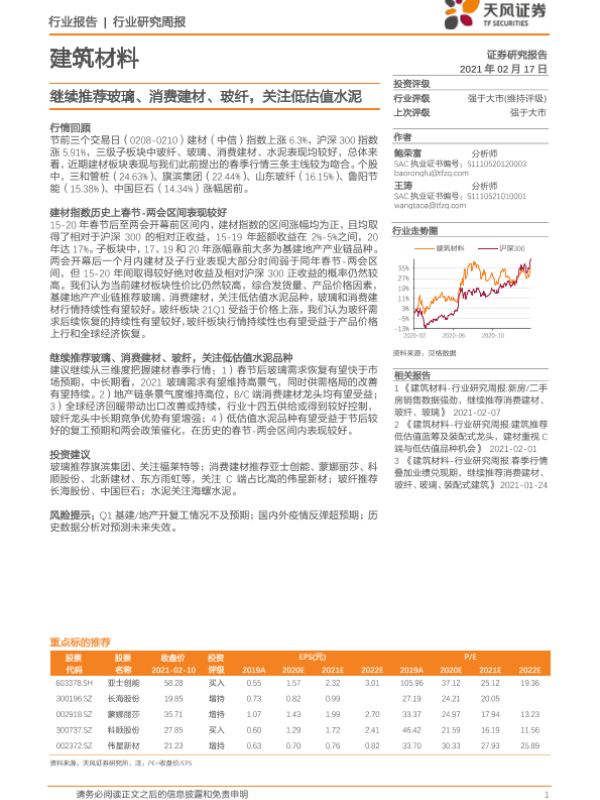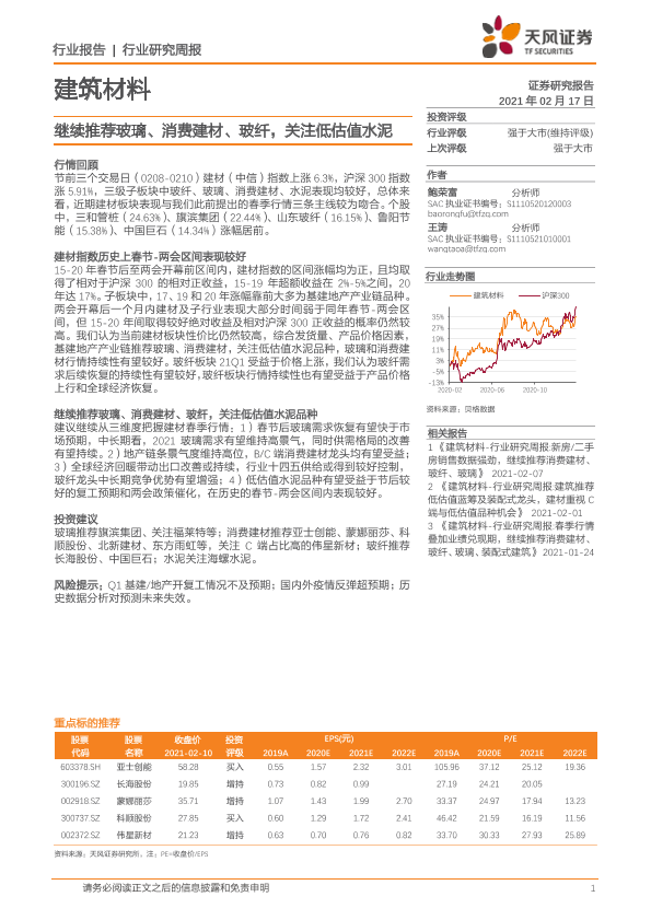 【天风证券】【20210217】建筑材料行业研究周报:继续推荐玻璃、消费建材、玻纤,关注低估值水泥-8页