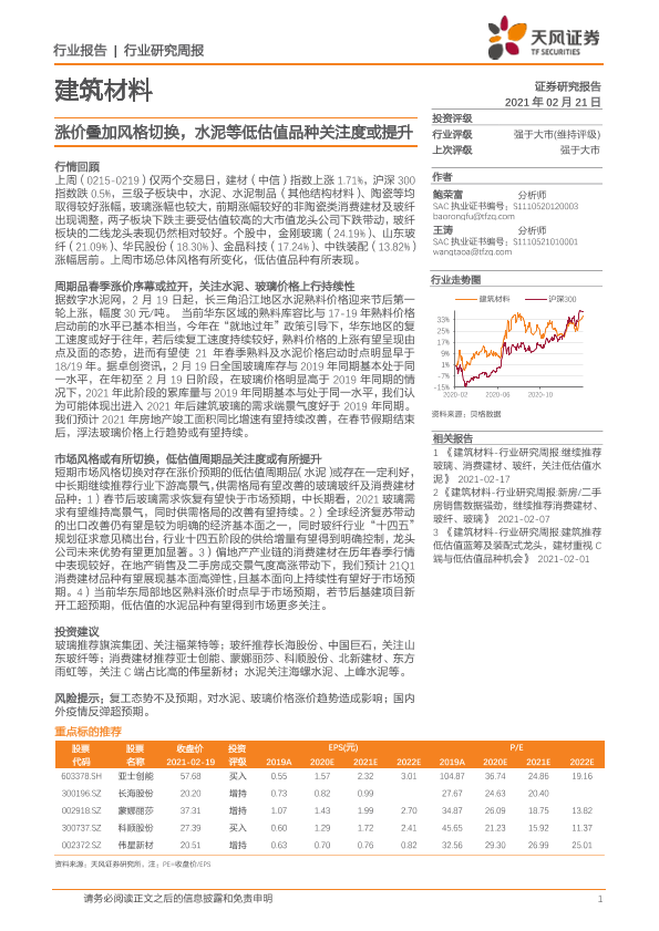【天风证券】【20210221】建筑材料行业研究周报:涨价叠加风格切换,水泥等低估值品种关注度或提升-5页