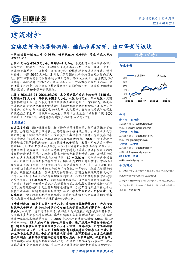 【国盛证券】【20210307】建筑材料行业周报:玻璃玻纤价格涨势持续,继续推荐玻纤、出口等景气板块-22页